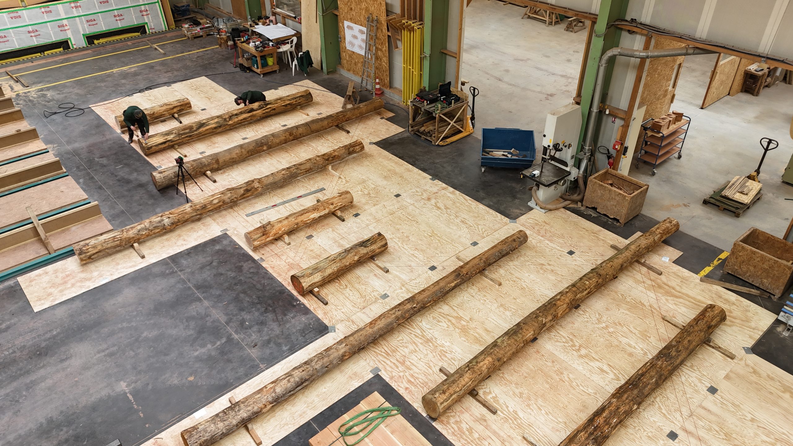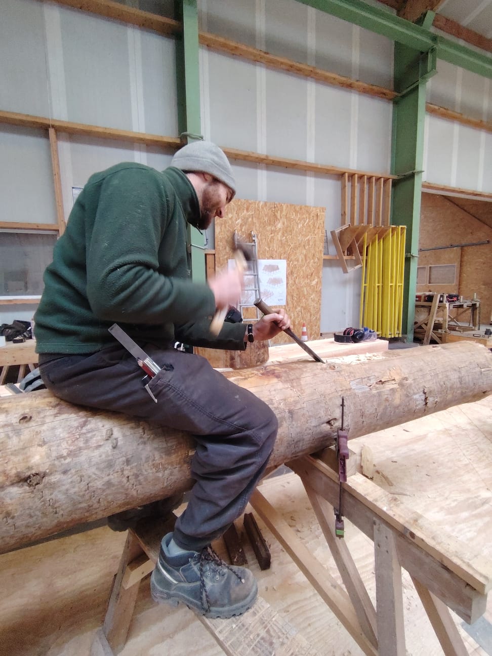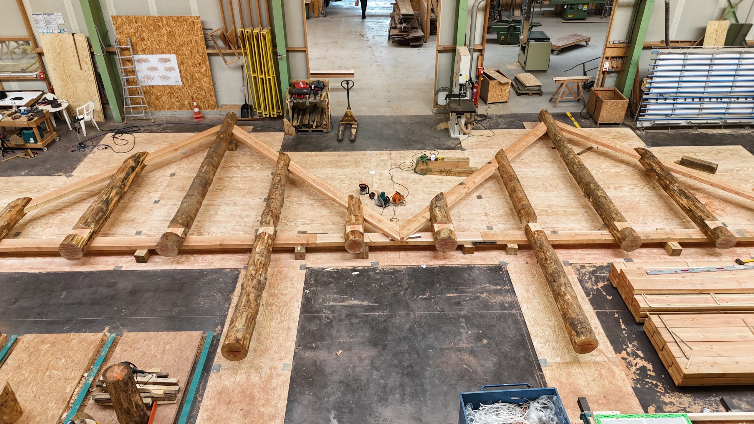 Rencontre chantier : Halle tout bois avec poteaux et poinçons écorcés en Douglas local