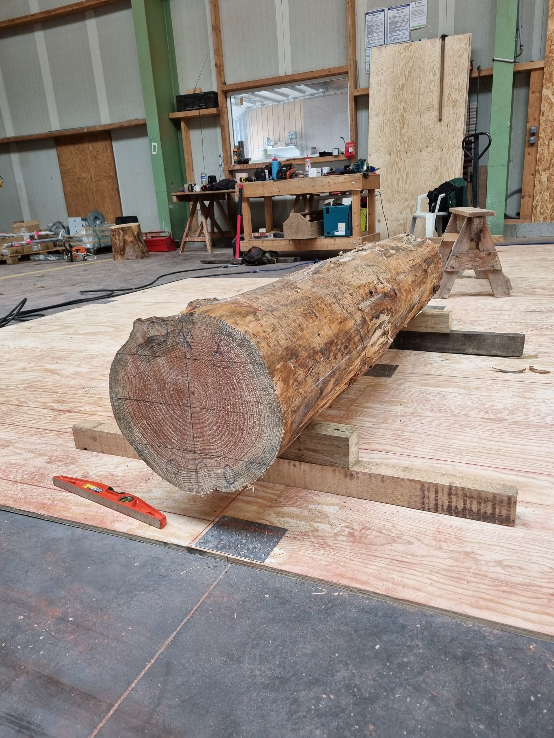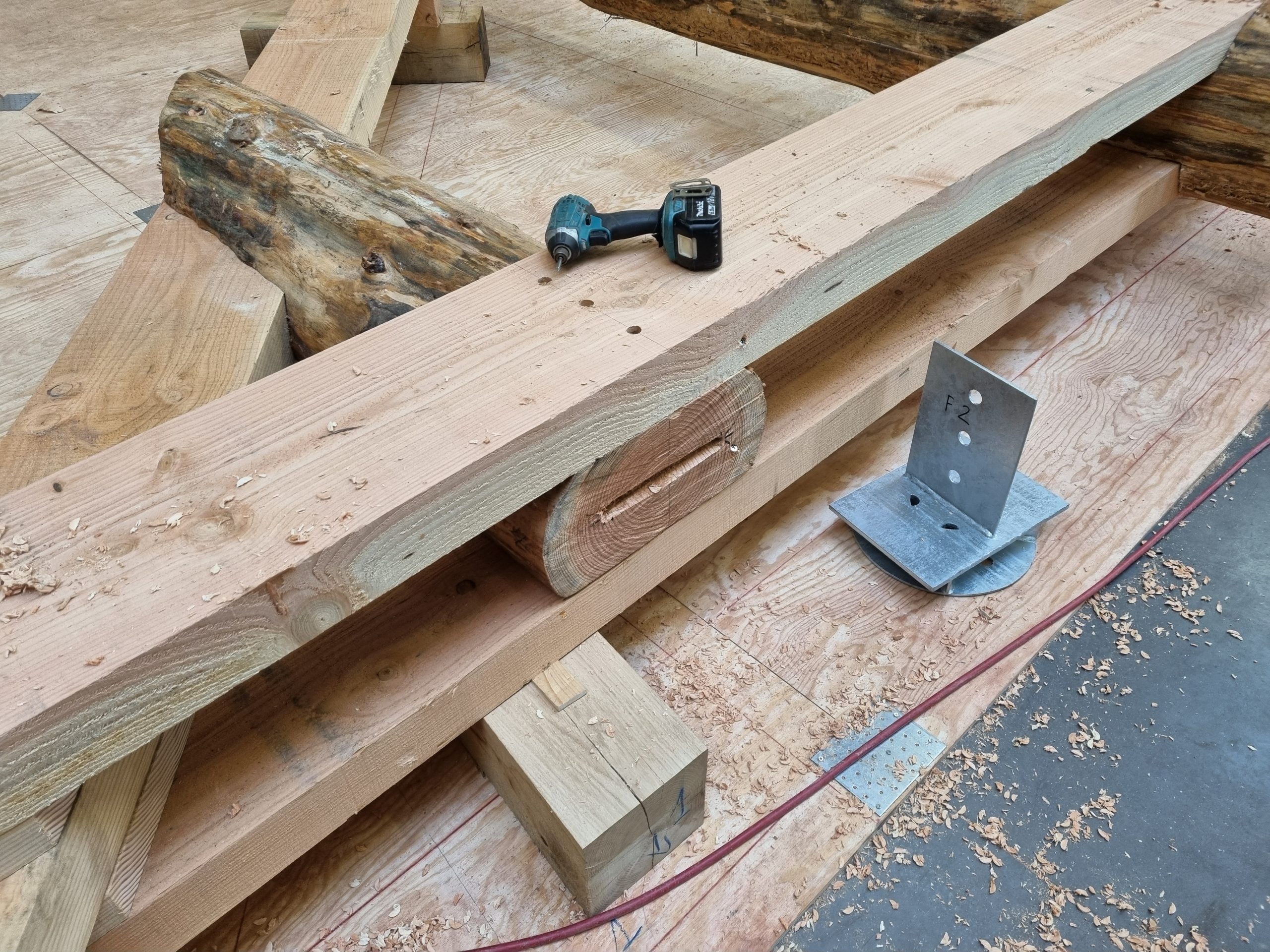 - Charpente en Douglas massif mixte équarris et 32 poinçons en troncs bruts écorcés