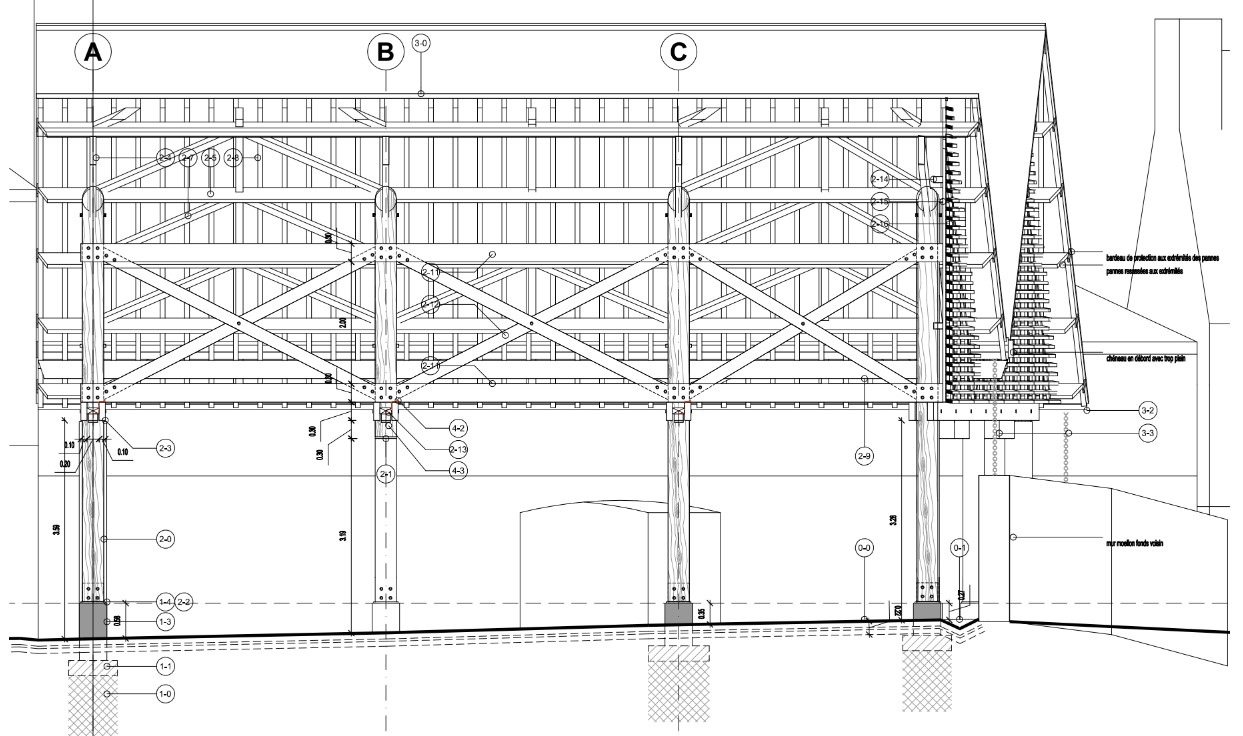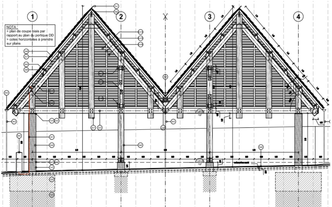 - Contreventements longs pans par poutres treillis à croix de St André assemblées à mi-bois